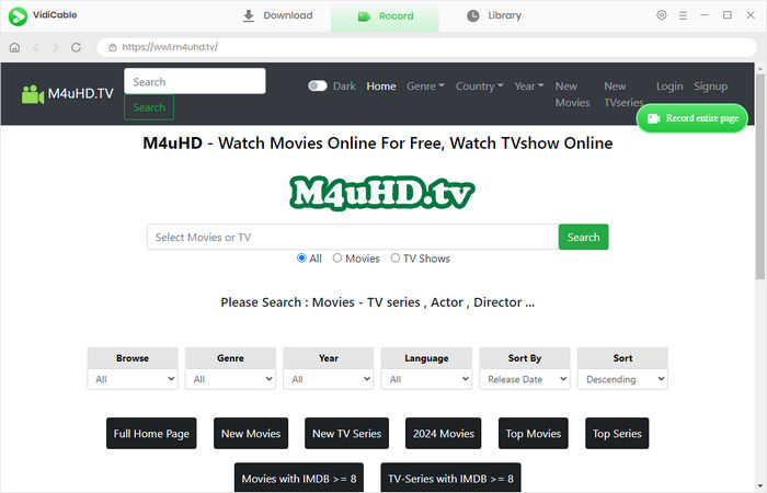 VidiCable features a built-in browser, allowing you to stream content directly within the program. Find the movie you want to save by browsing the website.